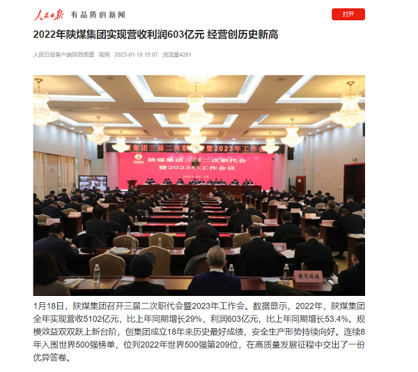 1月18日,陜煤集團公布數(shù)據(jù)顯示,2022年,陜煤集團全年實現(xiàn)營收5102億元,比上年同期增長29%,利潤603億元,比上年同期增長53.4%,創(chuàng)集團成立18年來歷史最好成績。 2022年,陜煤集團各實體產(chǎn)業(yè)板塊緊扣供需實際,積極實施相機調(diào)控,有效實現(xiàn)了提質(zhì)、穩(wěn)量、增效目標。其中,完成煤炭產(chǎn)銷量2.3億噸,各類化工產(chǎn)品產(chǎn)量接近2000萬噸,發(fā)電量突破500億度,粗鋼產(chǎn)量保持在1200萬噸水平,其他實物量指標穩(wěn)中有進。 同時,集團全面發(fā)力“雙智”建設(shè),在行業(yè)率先開展數(shù)據(jù)標準化治理和智能專網(wǎng)建設(shè),上線運行智能礦井地質(zhì)保障等8大智能信息系統(tǒng),并入選工信部“2022特色工業(yè)互聯(lián)網(wǎng)50佳”榜單。7處全國首批智能化示范煤礦通過國家驗收,彬長、黃陵等5個智慧礦區(qū)先后建成,建成智能礦井28處,研發(fā)應(yīng)用智能快掘系統(tǒng)76套、智能機器人198個,智能化產(chǎn)能占比達99%。“智能掘進機器人系統(tǒng)”獲國家首臺套重大技術(shù)裝備認定,全國首臺套450米超長智能采煤工作面投入運行,10米超大采高智能化采煤機進入制造階段。 集團還積極推進綠色轉(zhuǎn)型,在重點行業(yè)企業(yè)大力開展環(huán)保設(shè)施運行能效大會診,全年投入資金18.3億元,實施94項設(shè)施提標改造工程,鋼鐵、水泥、電力等板塊企業(yè)已實現(xiàn)大氣主要污染物超低排放。全面建成煤礦地質(zhì)環(huán)境監(jiān)測系統(tǒng),部署監(jiān)測設(shè)備1500余套,實現(xiàn)遙感監(jiān)測覆蓋2059平方公里,實現(xiàn)重點部位環(huán)保監(jiān)測全天候覆蓋。 在技融雙驅(qū)疊加成長方面,德國、日本技術(shù)研究院相繼落地,六大研究院、七大產(chǎn)業(yè)示范基地與秦創(chuàng)原30億元基礎(chǔ)研究創(chuàng)新基金,聯(lián)合搭建的“7個國家級+50個省級”科研平臺,正在發(fā)生耦合與聚變。目前已累計組建科技經(jīng)紀人團隊81個,組建引進6支“科學(xué)家+工程師”隊伍,積極推進249項基礎(chǔ)研究項目和10個工業(yè)化示范項目,全力打造原創(chuàng)技術(shù)“策源地”。 2023年,陜煤集團將繼續(xù)踐行安全生產(chǎn)、經(jīng)濟增長、能源穩(wěn)價保供等責(zé)任和使命,努力完成營收5500億元和利潤500億元的工作目標,全力推動陜煤集團創(chuàng)建世界一流企業(yè)再上新臺階。 |